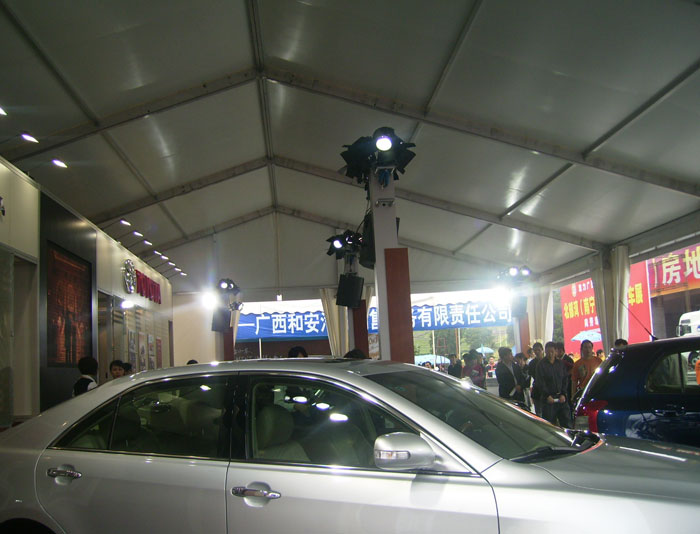 2、照明設(shè)施:車(chē)展上必然會(huì)有很多的活動(dòng),所以照明也是不可缺少的,對(duì)于照明設(shè)施也是車(chē)展篷房經(jīng)常配置的設(shè)施。