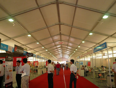 展覽篷房采用高強度鋁合金框架,雙面PVC涂層篷布,蓬內(nèi)無支柱。蓬內(nèi)使用容量寬廣,大型展覽篷房有10米到50米多種跨度,單元長度有3米、5米兩種,并且有多種高度可供客戶選擇。